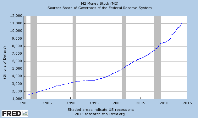 2. Debt monetization i.e. QE is simply overlooked as the price of doing business in growing the equity markets. As I previously noted, market participants were aghast at the sheer size of the original TARP. Now we can’t live without it, but it’s tapering. According to a Bloomberg survey of 41 economists, the median forecast is for the Fed to taper by $10B over the next 7 FOMC meetings until there is no longer any sort of QE. Do you agree? That’s a tough one to swallow. Below you can see the growth in the M2 money stock since the turn of the century.