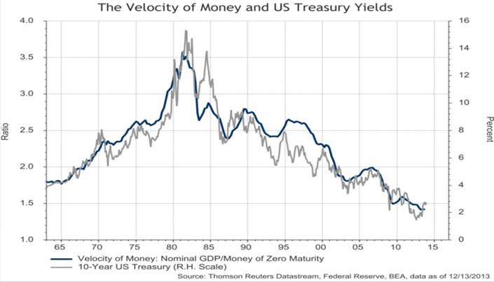 As it stands, there is a terrifically tight correlation between 10-year US Treasury yields and money velocity. Since everyone and their mother expects the fixed income market to lift the yield of Treasuries, it stands to reason that velocity will be joining the ride. Everything is always about timing, though. None the less, observe the following chart courtesy of Business Insider, via Harrell at Loomis Sayles.