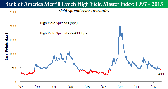 3. But in the meantime, the co-policy of ZIRP which has helped to enable the efficacy of QE has destroyed what it means to traditionally and conservatively save your money. ZIRP is forcing everyone to speculate, plain and simple. Savings accounts and CD’s pay nothing. Because of that, more and more reach for yield through the dividends of the stock markets. Even the high-yield debt market continues to perform robustly and I suspect it will continue until the T-rates begin to officially rise. The lack of spread between HY and plain old Treasuries is beginning to hit what, since 1997, has traditionally been the early part of a danger zone. Observe the following chart from Bespoke.