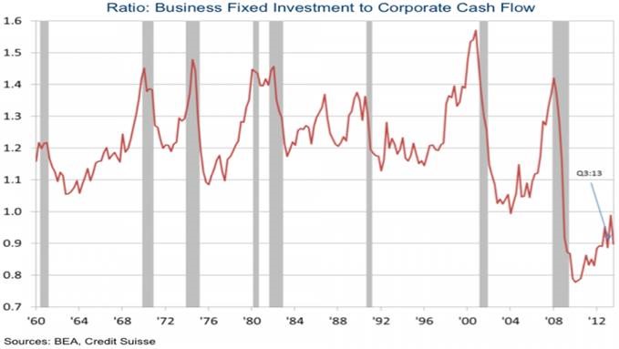 Have a look at this chart, also from BI, courtesy of Soss at Credit Suisse. It displays the ratio of business fixed investments to corporate cash flows. You can see it is still at its lowest points over the last 50 years. Corporations just don’t want to spend their money on CapEx.