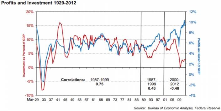 Just look at that spread on the right side of the chart. It’s very telling of the current methods being utilized to generate further corporate earnings without the CapEx investment to build a solid foundation for future earnings growth. At some point soon though, that spread will begin to converge as the US should see genuine economic progress. Companies will actually begin to invest in their future as opposed to just provide shareholder value through buy-back’s and divvy’s.