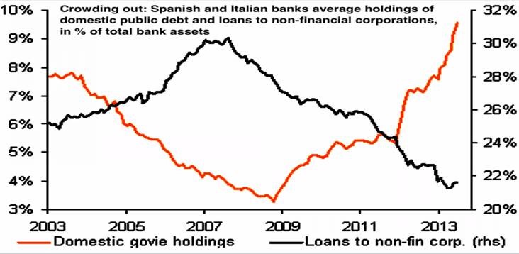 Why lend to entrepreneurs or businesses in need when you can lend to sovereigns and use that asset as collateral in additional transactions in an endless chain of profit generation. The widespread acceptance of the current banking model is truly a thing to behold. Have a look at a couple of countries from over in Europe who simply appear to be clueless. This chart from BI, via Commerz Bank, shows how the Italian and Spanish banks are simply reflating their balance sheets in an attempt to stay resuscitated for as long as possible before the ECB starts monetizing like they’ve promised. Unbelievably, the entities that need access the most to that capital to help grow each respective economy is barred from access as the banks maintain their favorability to “govie” holdings.