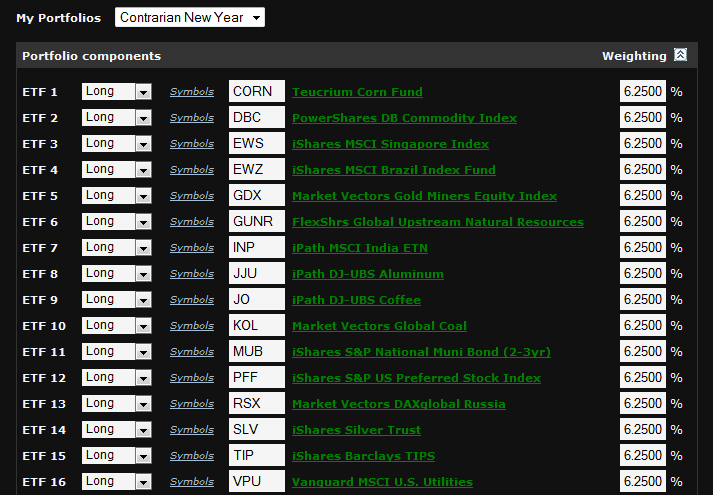 Just for ha-ha’s, we’ll track another portfolio in 2014 of purely contrarian plays. Construction of this portfolio should be obvious to most, but have a look at its make-up. It’s titled Contrarian New Year.