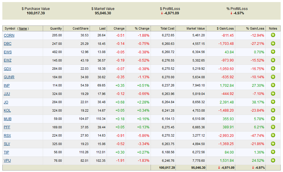 Remember, that these sample ETF portfolios are not investment recommendations and I reserve the right to allocate my own funds as I see fit into or out of any of the fore mentioned investment products. If you’re interested in some of the more professional portfolio metrics and want backtest results, Sharpe ratios, alpha and beta, correlations, etc., then too bad. Go look it up yourself. The name of the game in 2013 was absolute performance and so that is what we are measuring in 2014 with these ETF experiments.