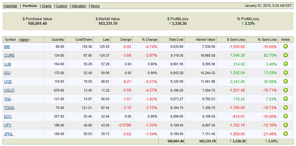 Update 1/4/2015: Say goodbye to 2014, the year of nothing specifically working except holding everything. Obviously, the adroit speculator was able to generate income in various and specific asset classes. However, the casual investor trying to pick stocks or even the majority of hedge fund managers were both trounced again by a levered ETF of the S&P 500. So much for trying to follow the trend while also also trying to be contrarian. That little thought experiment crashed and burned. I have a strong suspicion that indexing ain’t gonna be as easy as it’s been the last 2 years but who knows. I’ll leave these results up for the rest of the month and then bid adieu to this specific page regarding the 2014 experimental portfolios. Maybe I’ll come up with something else to add to the site, but at the rate I’ve been posting, don’t get your hopes up. Good luck in 2015, muppets!