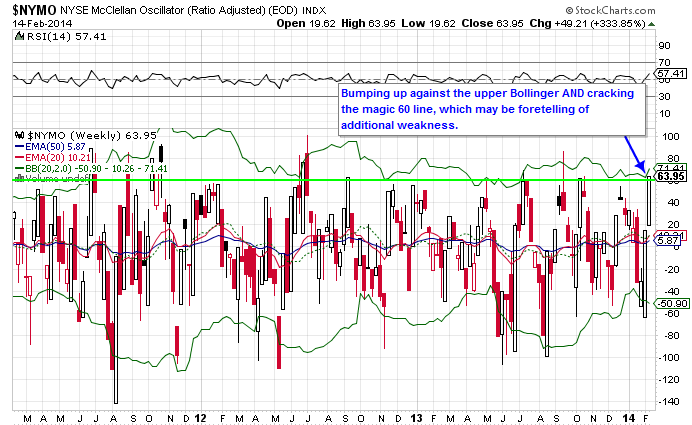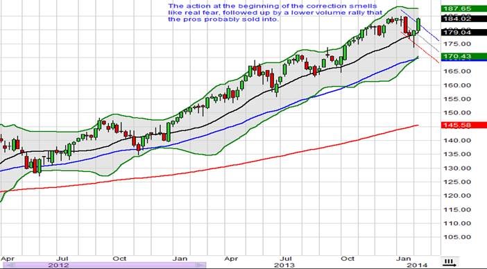 I think when this correction resumes, we’re looking at an endpoint underneath the 50-Day EMA(blue line). I think it’ll kiss that into the 165ish area before bottoming out. I just don’t believe that a 6% move down is the end of it. In 2013, all the corrective moves capitulated at the Bollinger mid-point. From the wide ranging fear that I observed, that just doesn’t feel appropriate for the correction here to start 2014.