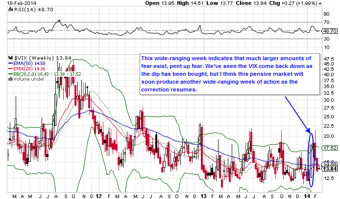 I have no worries that the major uptrend will resume after the corrective washout. These markets have been in need of a steam release for some time, but the obvious path of least resistance is upward. Those little exhalations near the end of 2013 essentially counted as non-moves, so a little fear and loathing is healthy for the uptrend to renew with some vigor going into the 2nd quarter. There are a couple of additional asset classes that may potentially shed a little light as to further direction subsequent to the completion of the corrective move. First, there is the yield on the 10-year Treasuries:
