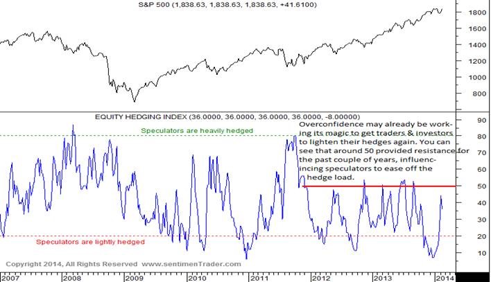 One last set of charts I’d like to share is the Equity Hedging Index(“EHI”). The EHI is one of the many proprietary models that can be found at SentimentTrader.com. It’s a contrary indicator, meaning lower extremes in the chart should produce a rally in the markets and vice versa. The EHI aggregates several inputs such as cash raising, Put purchases, and various other factors in order to construct a usable indicator. For more details, visit the site and take a free trial to see if the service is right for you. As I’ve stated on numerous occasions, I do not receive any compensation from them and I’m quite confident they don’t even know the MarginRich blog exists. Fortunately for my readers, Jason Goepfert, proprietor of SentimentTrader, is cool enough to allow people to republish his work as long as it’s not excessive and the work is credited.