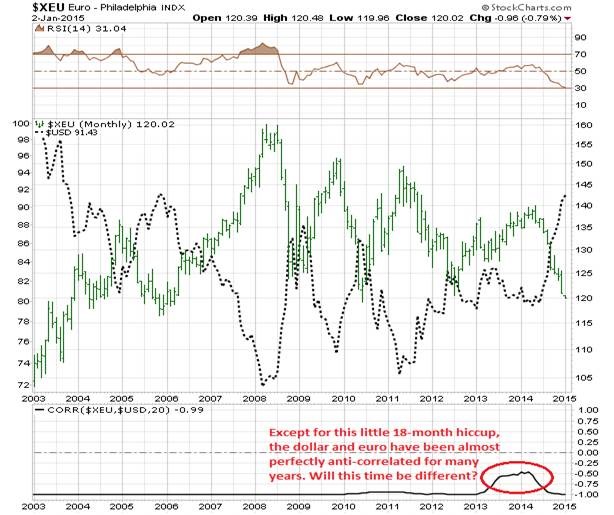 While the euro appears to be possibly setting up for a bounce off strong support, the dollar is running up against potentially strong resistance around 91 which also happens to have held for the last 10 years. This sets up a virtually perfect pair-trade between the euro and the dollar. Observe the dollar and euro’s nearly perfect negative correlation.