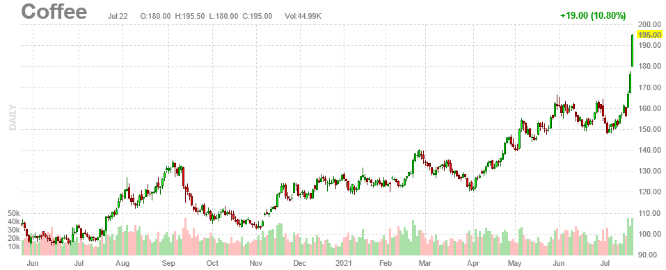 Wow, what an ignition for coffee. This all-important soft has shot up a rough 20% in three days as of today. That’s smoking momentum.