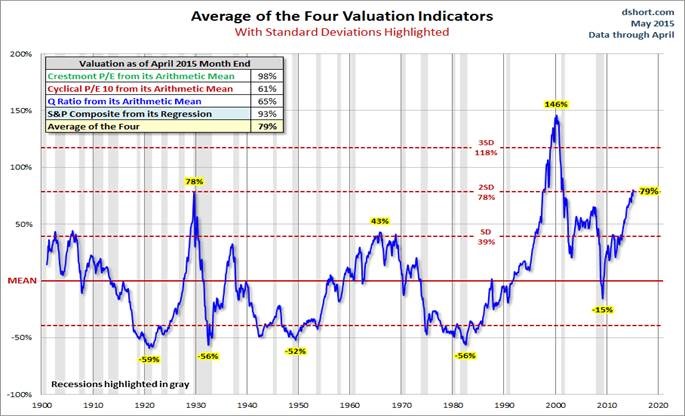 Doug Short provides charts that depicts the CAPE, which he calls P/E 10, and Q plus the Crestmont P/E and S&P 500 regression from its price. One chart that particularly captures the moment in valuations, allowing for some perspective, is the Average of the Four Valuation Indicators with the standard deviations highlighted. Observe: