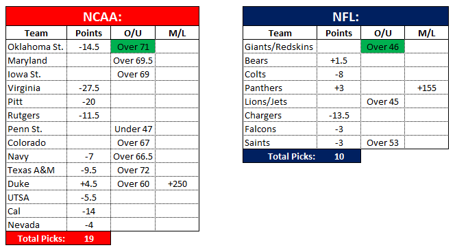 It’s easy to go online and make a claim. But I’m willing to toss my picks out there to see if, at least for this week, I can walk the walk. I have found that the books consistently underrate and overrate scenarios regarding offenses, defenses, upper-classmen, returning players, coaching, the “saltiness” of a team, and many other factors. These misratings of risk are what create the asymmetric opportunities for generating profit. Have a look at the Auburn/Kansas St. game. I played the under as both defenses are stout with heavy run-based attacks. They scored a total of 34. Winner, Winner…except I failed with the Auburn pick on the points.