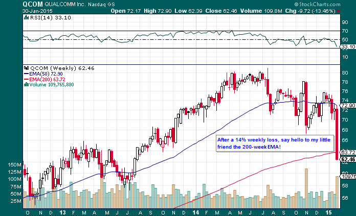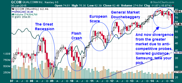 Since the start of the 2nd half of 2014, Qualcomm has had a rough go of it. After peaking at $81.05/share, it’s been all chop and drop. Just look at that massive 14% drop in the share price last week subsequent to beating earnings estimates but confirming that Samsung will drop Qualcomm’s Snapdragon chipset and go in-house with its own proprietary technology for the new Galaxy release.
