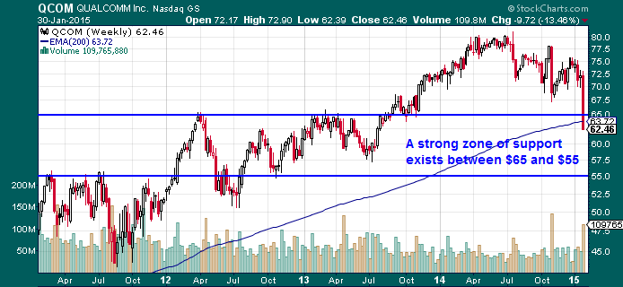 Valuation depends on the variables in your model and what factors you prefer to place the most influence. As a potential long-term addition to portfolios, these share prices warrant a look. Let’s take one last look at the technicals. Qualcomm has dipped its toes into what appears to be a very strong support zone. As always, anything is possible in these highly volatile markets, so tread carefully.