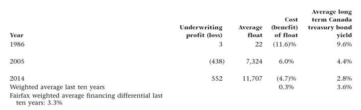 Arguably, the most important component of an insurance business to analyze is the float. Watsa has been very forthcoming about Fairfax’s float levels and how the float has positively affected the company’s “cost of capital” to invest. Disciplined underwriting allows Fairfax to essentially be paid to let one of the greatest investors in North America to invest it’s capital. Observe the following chart depicting some of Fairfax’s long-term float performance.