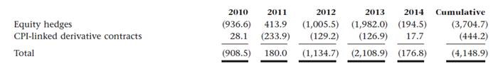 Notice how there was a slight improvement in 2013 and a doubling in value in 2014. This may be a precursor to broader market conditions as we saw the same thing leading up to the Great Recession. First, the valuation of the hedging program starts shifting positive and then the early bets pay off in spectacular fashion. It’s definitely something to keep in mind as you continue to invest in today’s markets. I would not discount the fact that Fairfax’s hedge book is beginning to increase in value.
