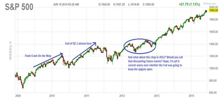 I’m not going to get into the facts and fiction of the mechanism. I just want to provide a little reminder that the forward looking ability of the markets gets a bit fuzzy at the extremes. Whether it’s is an epic crash, a normal correction, or a bottom-ticking nadir; at the extremes the markets don’t exactly send the clearest message. Have a look at the S&P 500 since 2009.