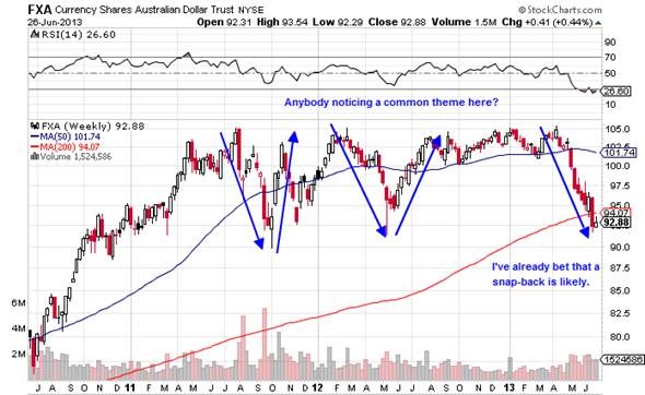 So getting back to the potential money makers I referred to earlier…the first one is on the Aussie dollar. The whole world is short the Aussie dollar. The basic macroeconomic rationale is that the Australian economy is centered solely on commodities and the sale of those commodities to China. With the whole commodity complex coming down, then the Australian currency is due for a dive. And dived it has due to speculators, bond vigilante’s, or the boogeyman. The fact of the matter is that the Australian economy, although possibly overheating, has not blown up yet nor has their housing market yet, either. The central bank of Australia has been raising rates as opposed to lowering, although I suspect that should change in the near future. And the bottom line is that when the whole world agrees on a trade, you simply have to go contrarian. Even if the macroeconomic rationale is correct, there’s still that little matter of timing. Recall gold and gold shares for proof of that. Anyways, observe the following weekly and daily charts of FXA, which as you should know from previous market notes, is an ETF proxy for the Aussie currency.