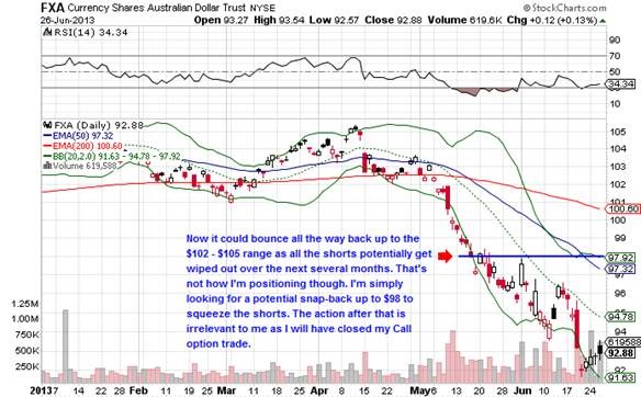 The hedge funds, family offices, and wealth managers can borrow in a stronger or weaker currencies and short or go long another. That’s a carry trade done on margin. It can blow up spectacularly when done in things like borrowing Yen on margin to buy US safe, dividend paying stocks. It works till it doesn’t and then it can blow up fantastically, which is what we have seen this month. Obviously, I’m not operating on that level. Our trade is the September Calls at a $98 strike on the FXA. These options tend to trade with a little bit wider spreads of around $0.10 despite adequate liquidity, so as of 6/26 each Call was trading between $0.40 and $0.50. Do not put more than 2% of your trading capital at stake in the trade. I use a very wider stop-loss generally on option trades. Sometimes you gotta give a thesis time to marinate and that’s what going far enough out with a wide stop-loss allows. Not to get too remedial or insult your intelligence, but let’s do a quick example of what that looks like. Hypothetically you have $10K to trade and a 50% stop loss. That means you’re willing to risk $200, which means that you’d place $400 into the trade if you’re using the 50% stop loss. The resistance point of $98 is a pre-planned sell price, however feel free to liquidate earlier if you’re satisfied with the profits earned…after accounting for transaction fees of course. Full disclosure, I’ve already put the trade in play.