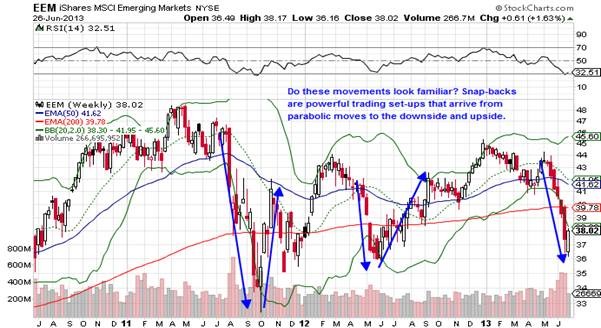 The second trade is in emerging markets. I spend hours every day scouring the web researching various markets and gathering usable intelligence that will allow for a potentially profitable trade set-up. One of the things of I’ve noticed over the last week or so is all the overwhelming negative sentiment on emerging markets. Once again, the whole world is short emerging markets. Literally, all I read are negatives on Brazil, China, India, and the rest of the developing countries and how the US is so strong, while the emerging market investment will destroy your portfolio. As I stated up above, when the whole world is in on a trade then you really do have to go contrarian. Look at the emerging market ETF, EEM. It has been destroyed in the last 4 weeks and with a serious gap-down just last week. In the daily chart we have two 2 beautiful set-ups that I love to see:  1. confirmation of the beginning of a snap-back, and  2. a gap-down that appears as if it will be covered as part of the snap-back. The weekly shows the snap-back consistency subsequent to a parabolic sell-off. Observe the following charts.