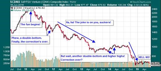 That’s where the juniors come in. Junior precious resource explorers have essentially been left for dead, and for good reason. For many actual producers, All-In-Sustaining-Costs (“AISC”) of mining are at or above the spot price of the base product. The efficient producers are able to produce at lower AISC or at least have scale to continue operating with solid margins. Often companies with a significantly lower AISC have ancillary mineral offsets that reduce the cost of mining the primary reserve. For example, a gold company may operate a gold mine that has significant silver and copper resources, as opposed to a gold company that may operate a mine that only possesses gold reserves. The point is that if producers are having a hard enough time in this environment then consider the bloodbath for the explorers i.e. the “liars standing next to holes.” Observe the HUI, the major gold company index, and the TSX Venture, where a majority of junior explorers are listed.